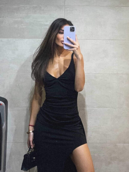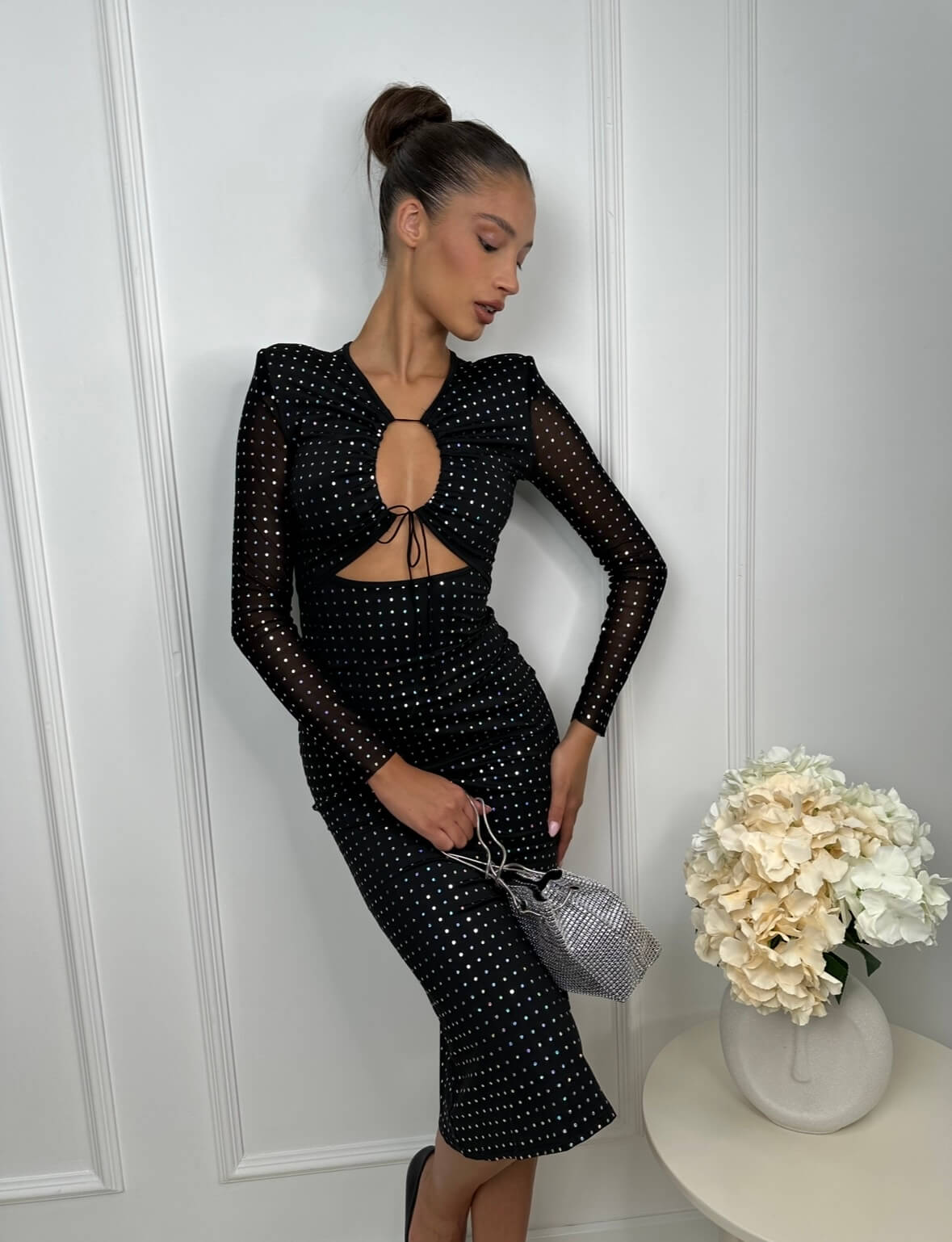 Elegantna crna svetlucava midi haljina koja je izuzetno privlačna i kao takva idealna za svečane prilike. Svojim efektnim sjajem ostavlja dojam glamura. Bez obzira da li je birate za specijalnu proslavu ili za večernji izlazak, ova haljina modernog dizajna garantuje da cete zasijati u svakom prostoru.